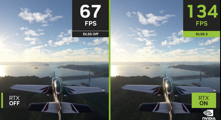 为了证明这一点,Huang 展示了几个简短的演示,展示了 DLSS 3 如何在保持光线追踪效果的同时,将赛博朋克 2077和Microsoft Flight Simulator等游戏的帧速率提高一倍。