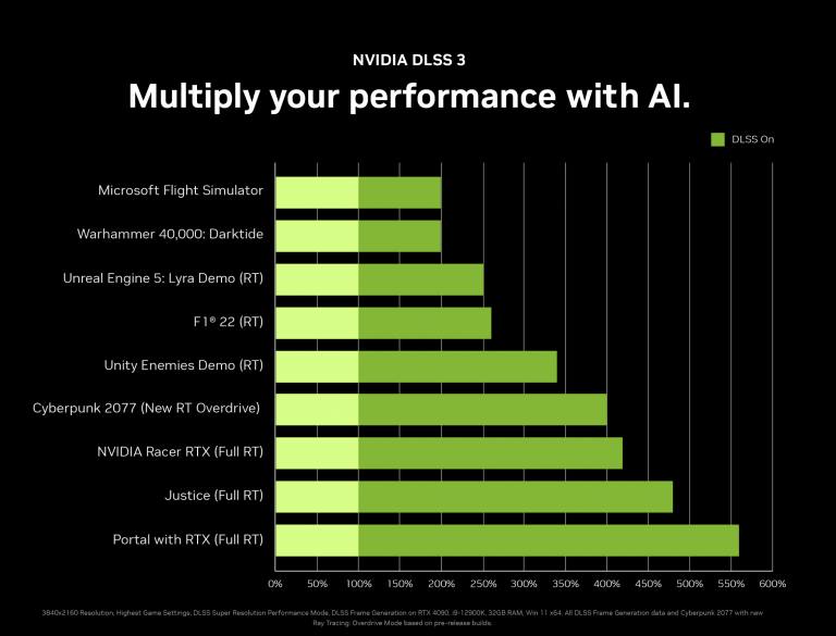 “DLSS 3 生成全新的帧,无需处理图形管道,将游戏性能提升至暴力渲染的四倍,”黄说。超过35 场比赛(在新窗口中打开)并且应用程序计划添加 DLSS 3 支持,首批游戏将于下个月推出。