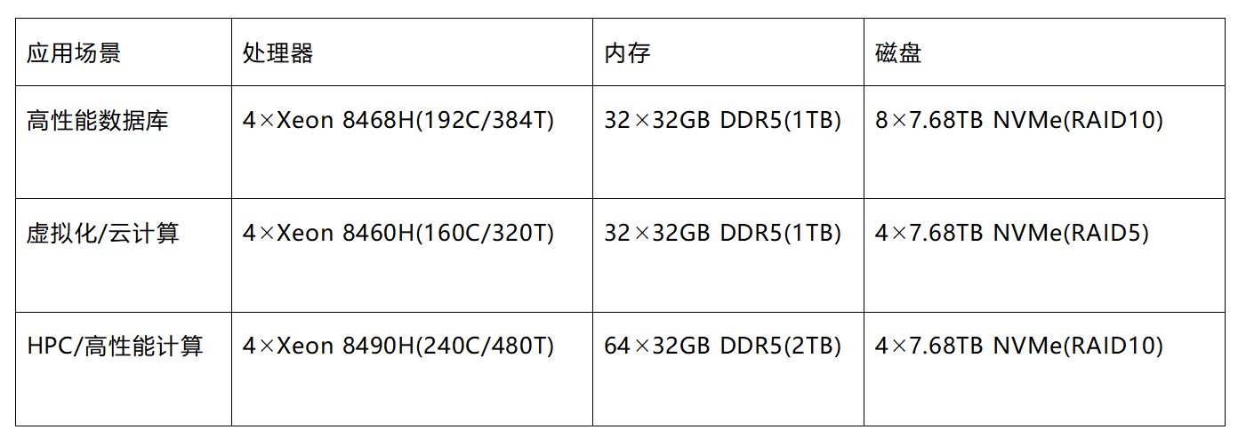 在不同业务场景中,金品KU2424-V4服务器的配置方案尽显灵活:高性能数据库场景下,4颗Xeon 8468H处理器搭配3232GB DDR5内存与87.68TB NVMe存储(RAID10),完美承接高并发交易;虚拟化/云计算场景中,160核心处理器与RAID5存储架构,平衡性能与冗余;HPC高性能计算场景则以240核心处理器与2TB内存,支撑复杂运算任务。