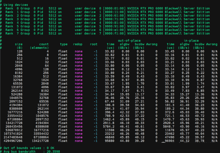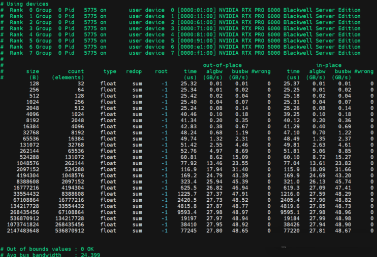 金品KG6208-V5 NCCL AllReduce,平均性能24.39GB/秒。